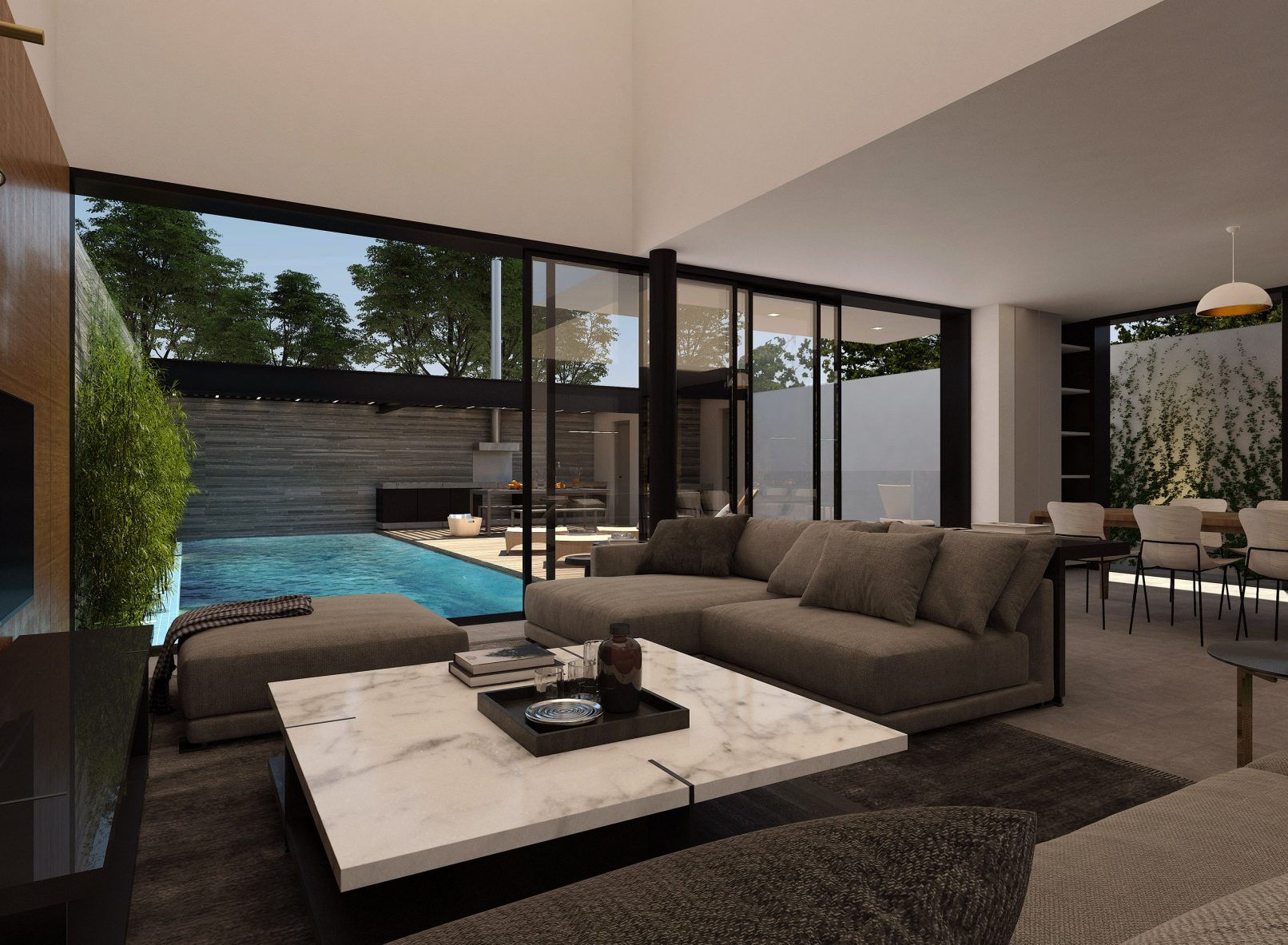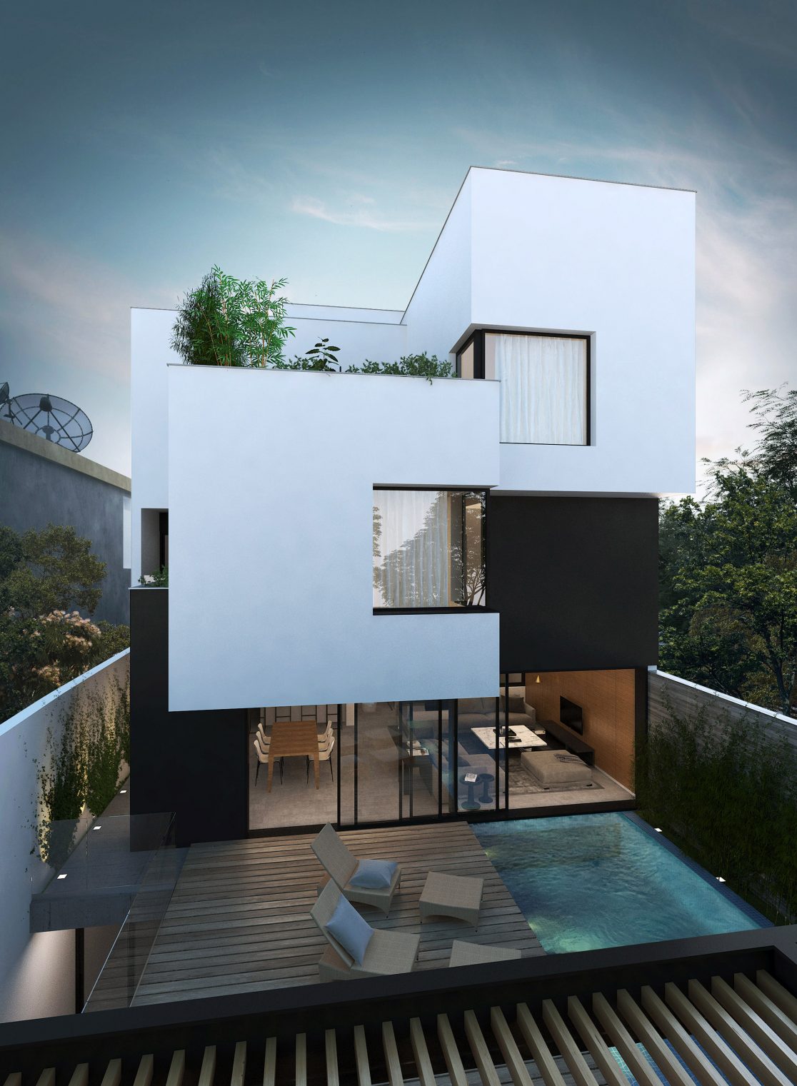 Vivienda unifamiliar en un terreno de 10 m x 35 m de fondo, se han aprovechado al máximo los espacios. El programa que era extenso. Planta sótano con dormitorio para el servicio, amplia lavandería, cava, gimnasio, sala multiusos, despacho, ventilados por un jardín interior, trastero y sala de máquinas. Planta baja con las áreas públicas, salón, comedor, cocina, despensa, aseo, un segundo estudio con baño. Cuarto de máquinas y baño de servicio, planta primera con 4 habitaciones muy amplias cada una con baño y su propia terraza. La última planta reservada para una máster suite conectada a una gran terraza ajardinada, walking closet, baño con jacuzzi y un gran despacho que conecta a un panic room. Todas las plantas están conectadas a un núcleo central de ascensor y escaleras con un gran ventanal hacia un jardín interior. Cuenta también con piscina y una pérgola con asador.